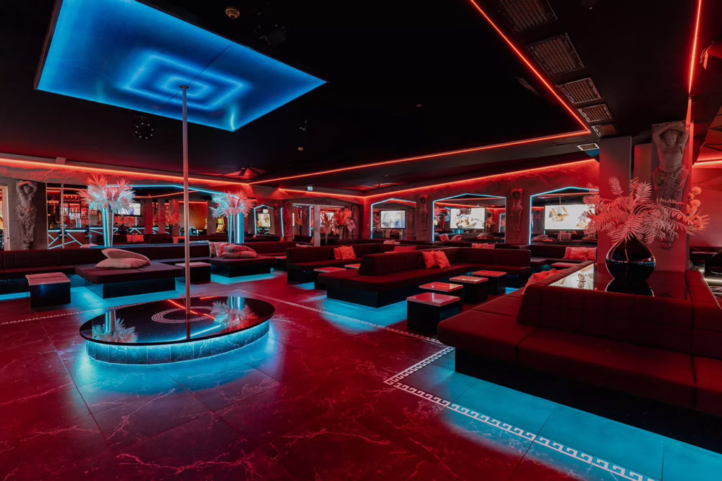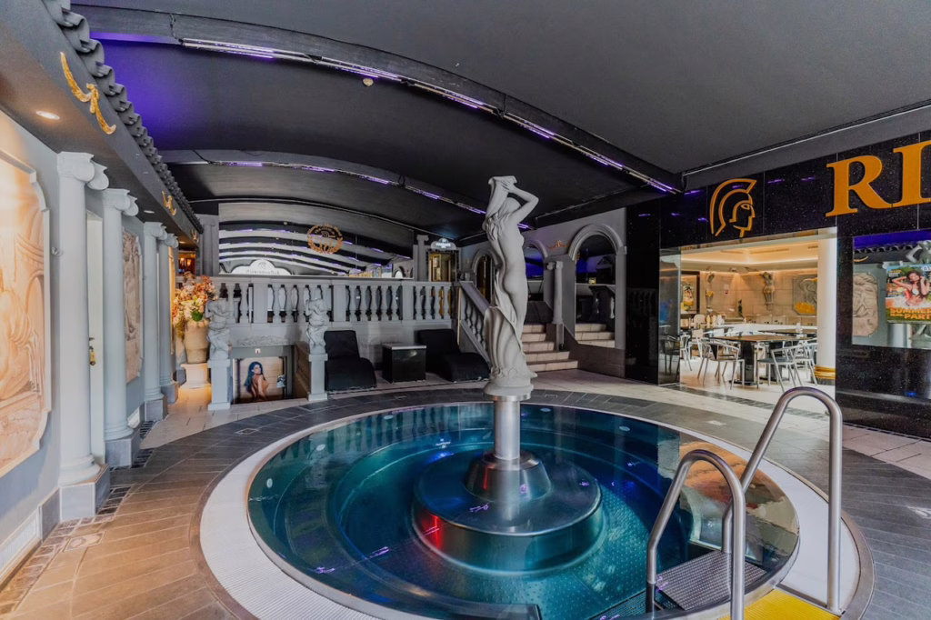 Oase 的装修风格是古罗马主题,到处都是古罗马风格的裸体雕塑和壁画。到了前台,支付65欧元入场费后,你会领到一件浴袍、一条毛巾、一双拖鞋,以及一个更衣柜钥匙。然后从前台左侧进入主大厅。大厅正面是一个吧台,除了红牛以外的所有无酒精饮料都是免费的,可以随时向吧台服务员要。左手边是一大片沙发区,中间有个小舞池,很多女孩会坐在沙发上等客人。有些女孩看到新客人进来,会主动上前说要带你参观场地,顺便推销自己。建议第一次来的朋友先礼貌拒绝这些邀请,先去洗个澡、吃点东西,把在场的所有女孩都看一遍,再决定和谁去房间。