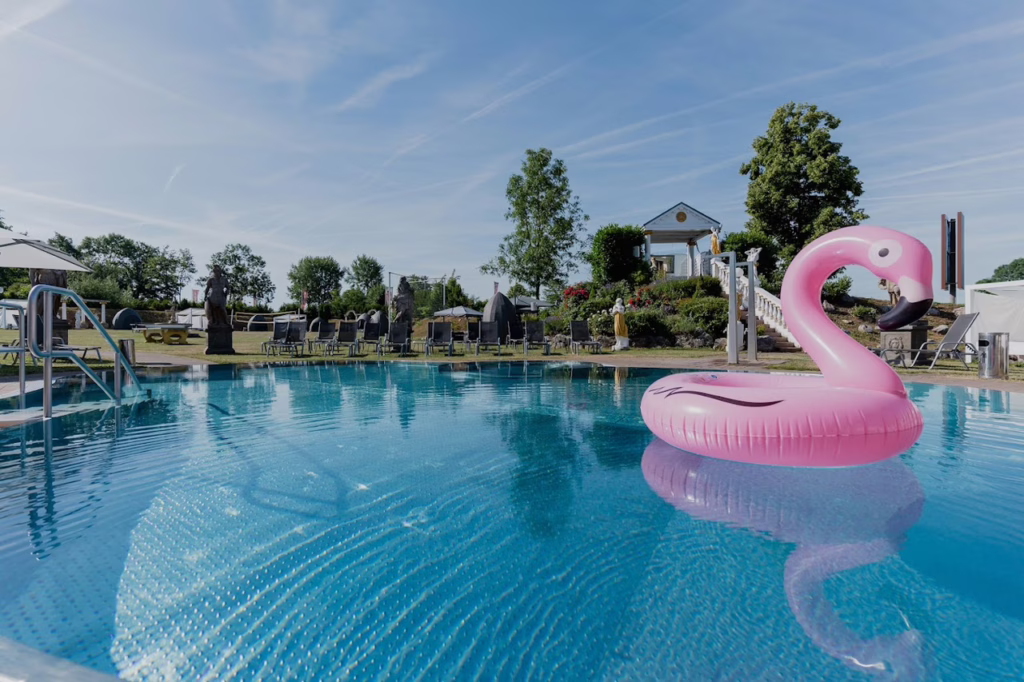 大厅的另一侧通往Oase的户外区域,我个人觉得这是Oase最大的亮点。户外有游泳池、乒乓球台、排球网和小足球场。天气好的时候,可以在外面游泳打球,看着全身赤裸的女孩们在阳光下自由走动,感觉十分放松惬意。作为 FKK,桑拿房当然少不了。可惜 Oase 只有一个桑拿房,对我这种不常蒸桑拿的人来说,里面的温度实在太高了。